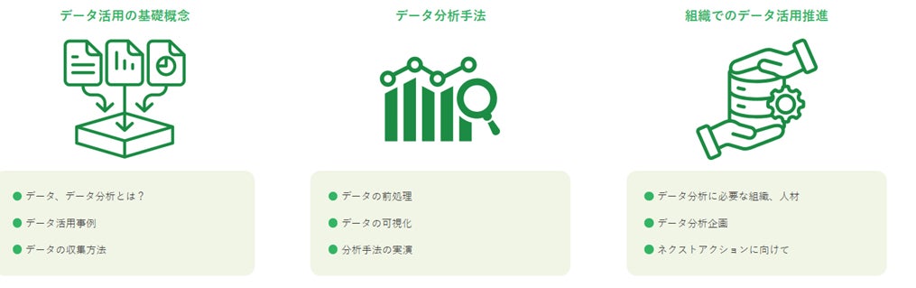 本研修では「データ活用の基礎概念」から「データ分析方法」「組織でのデータ活用推進」について学習いただくことが出来ます。