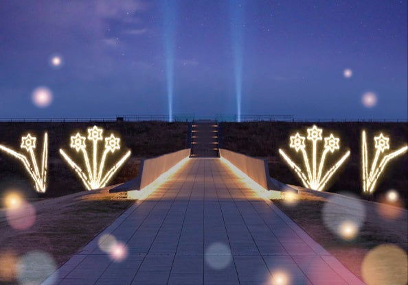 国営追悼・祈念施設を特別に夜間開園し、園内をライトアップする初めての催し。防潮堤にスイセンの光の地上絵を描く「光ノ碑(ひかりのいしぶみ)」に加え、市内で開催される催しとの連携により、オブジェやキャンドルなど、想いの詰まった装飾の一部を会場に展示。期間中は、市内保育所の協力による「紙袋ランタン」の展示や、語り部による「防災講演会」も実施します。