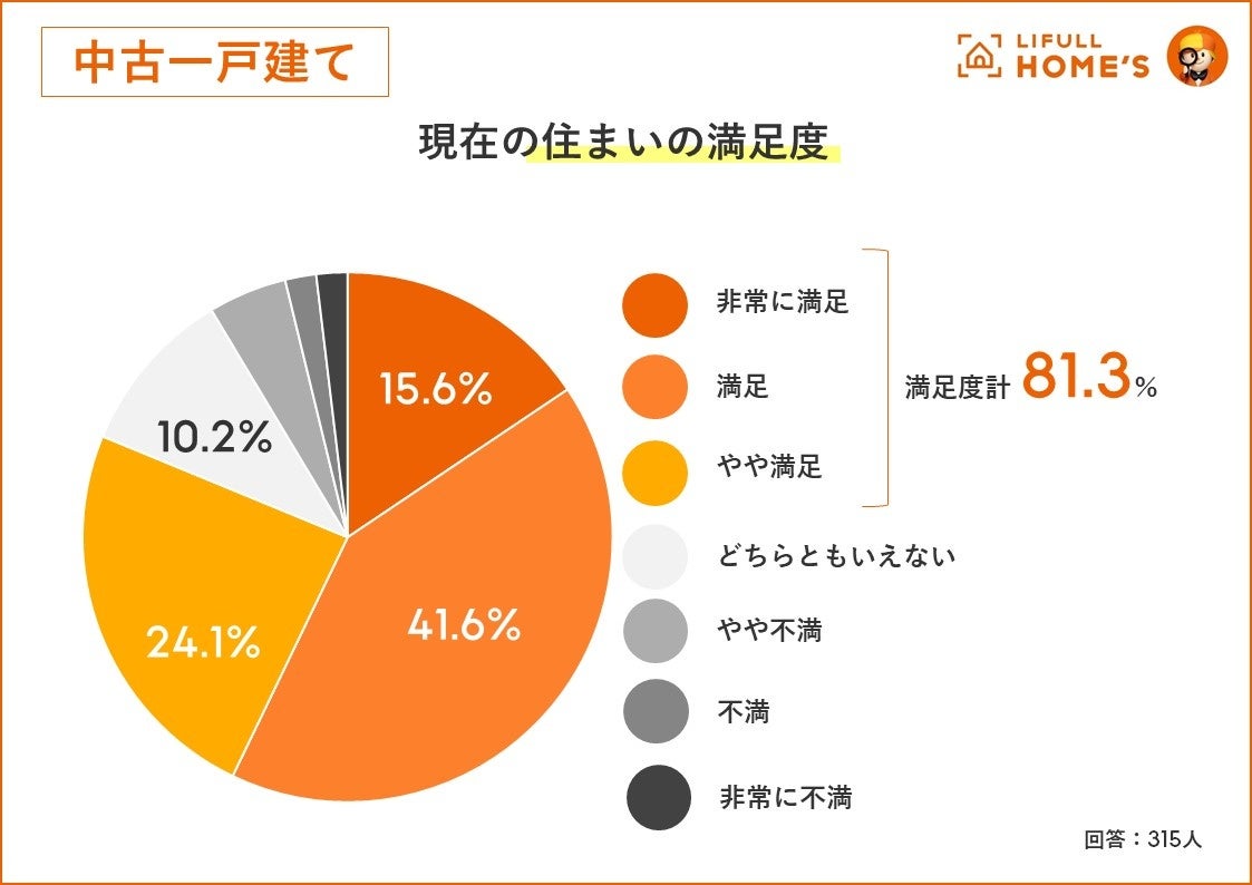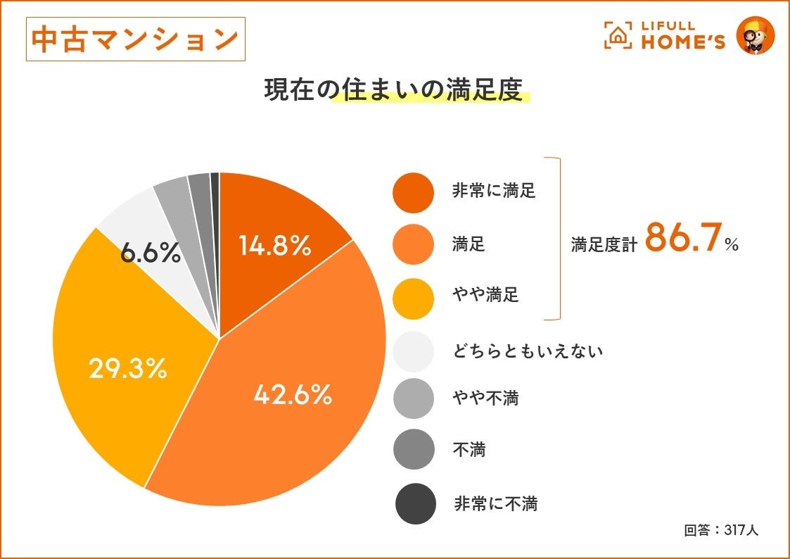 さまざまな懸念事項はあっても、購入後の満足度は高いようです。中古マンションでは86.7%、中古一戸建てでは81.3%が「満足(非常に満足、満足、やや満足計)」と回答しており、満足が不満を大きく上回る結果となりました。