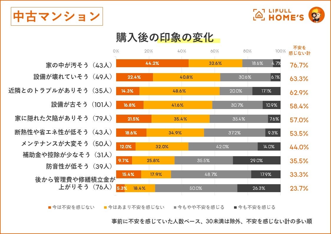 購入後に不安が薄まるのは「設備故障」や「ご近所付き合い」、購入後も不安が残るのは「お金周り」