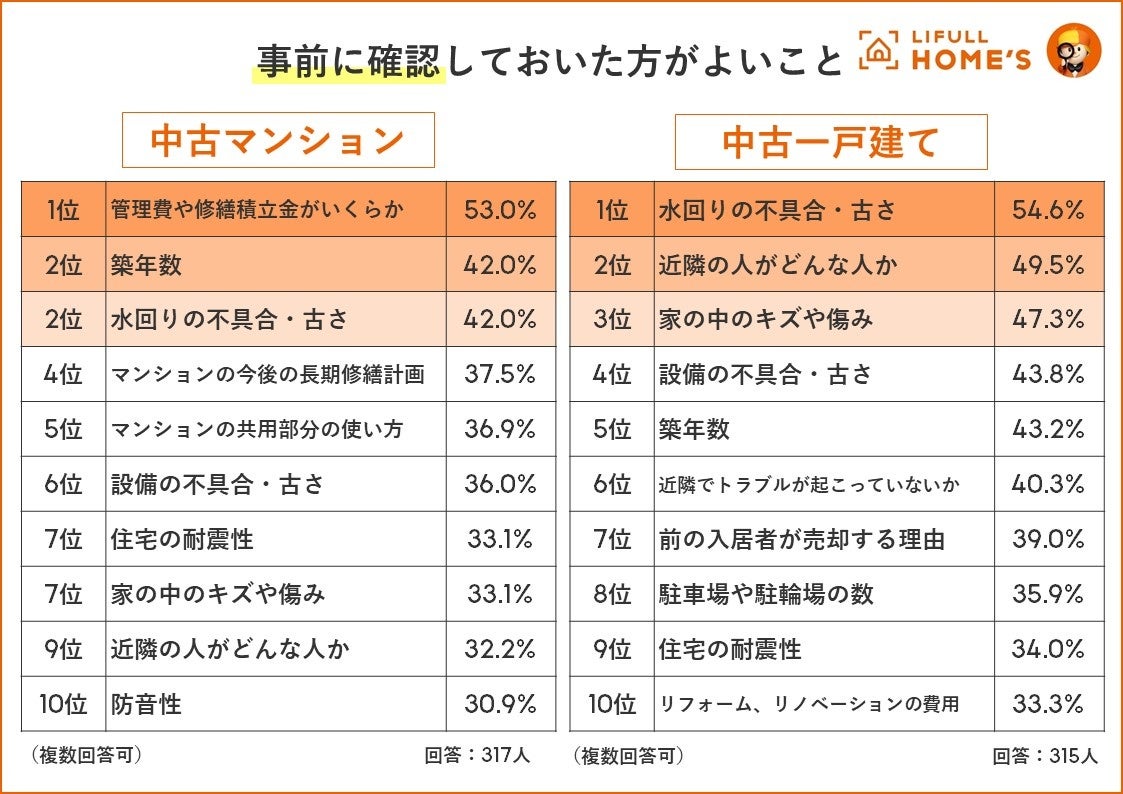 失敗をなくすために事前に確認しておいた方がよいことを聞いたところ、もっとも多かった回答は、中古マンションが「管理費や修繕積立金がいくらか」(53.0%)、中古一戸建ては「水回りの不具合・古さ」(54.6%)でした。これらは想定外の費用がかかることになり、家計を圧迫することにつながります。居住中のランニングコストへの不安がうかがえる結果とも見ることができそうです。