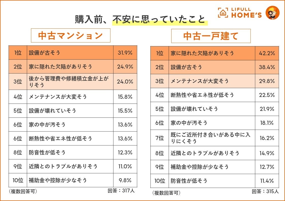 購入前の不安は中古マンション「設備が古そう」、中古一戸建て「隠れた欠陥がありそう」
