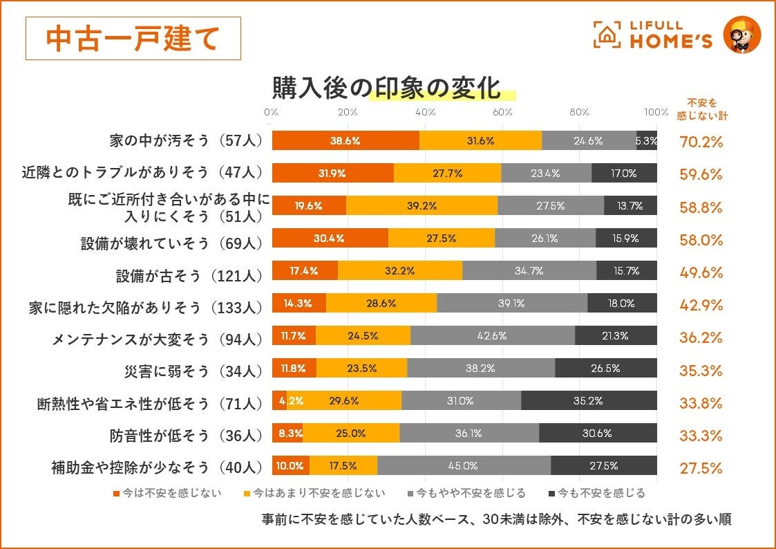 購入後、「設備の故障」や「ご近所付き合い」などで不安が薄まる。一方でお金周りなど拭えない不安も。