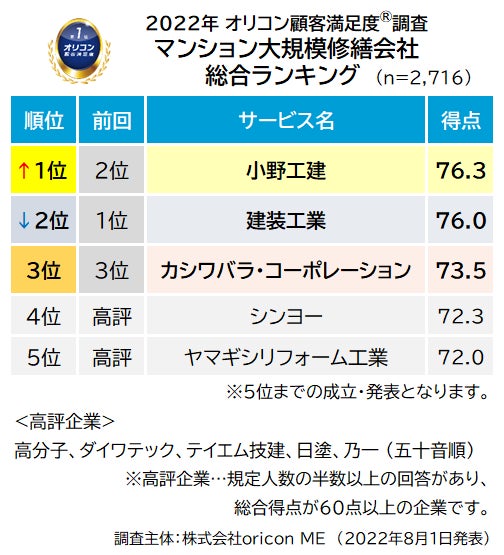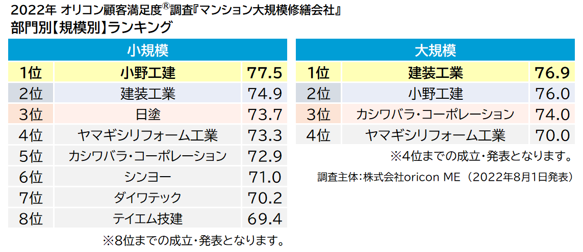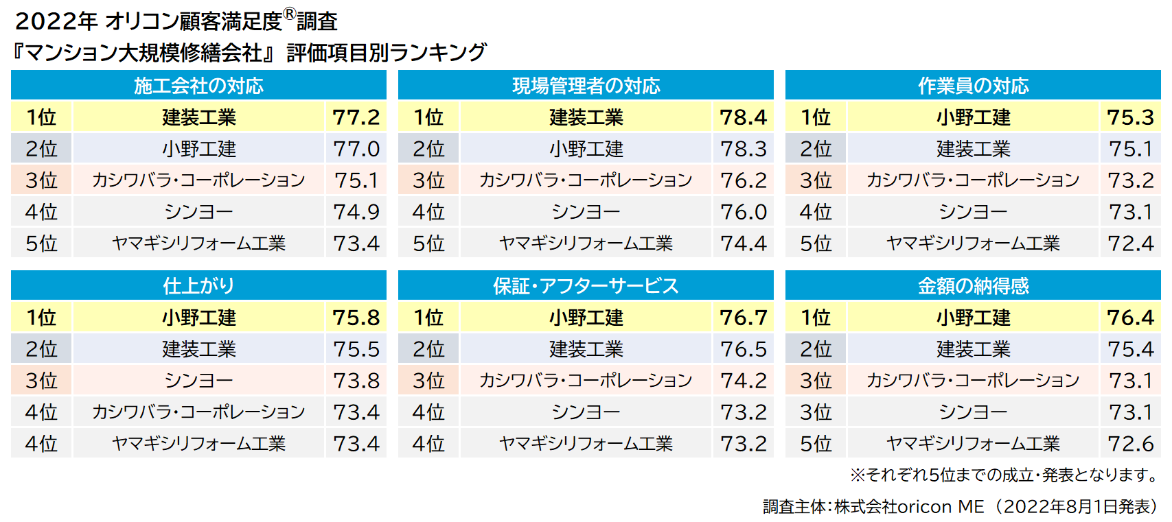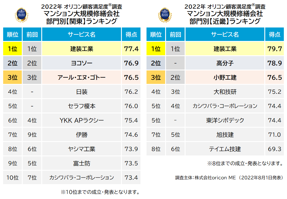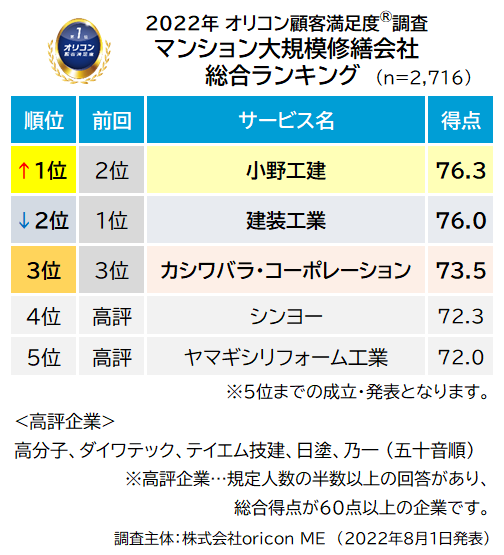 2022年 オリコン顧客満足度(R)調査 『マンション大規模修繕会社』ランキング