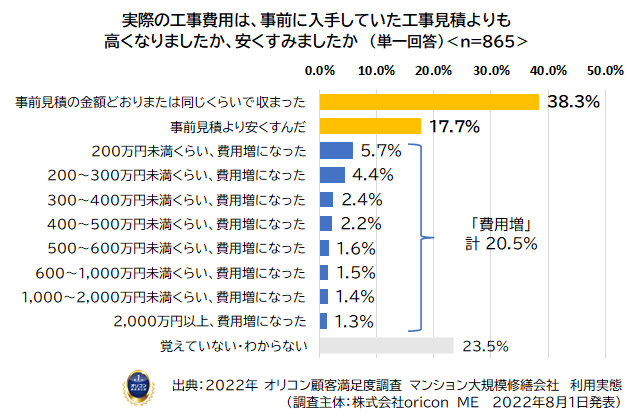 まず、①「事前見積からの費用変動」<単一回答>では、「事前見積の金額どおりまたは同じくらいで収まった」が38.3%と最も多く、「事前見積より安くすんだ」という回答も17.7%に上りました。一方、「200万円未満くらい、費用増になった」(5.7%)をはじめ、「費用増になった」という回答は計20.5%となりました。