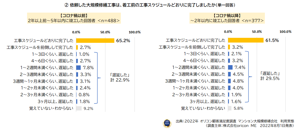 つづいて、②「工事完了日の遅延の有無」<単一回答>について、「工事スケジュールどおりに完了した」という回答の割合は、竣工時期が「2年以上前~5年以内【コロナ禍以前】」の回答者では65.2%、「2年以内【コロナ禍以降】」の回答者では61.5%と減少傾向に。コロナ禍以降、「スケジュール通り」は厳しいことが伺えるなか、利用者からは「コロナ禍で大変な中でしたが、特にトラブルもなく修繕を行ってくれた(40代・男性)」といった労いの声も見受けられました。