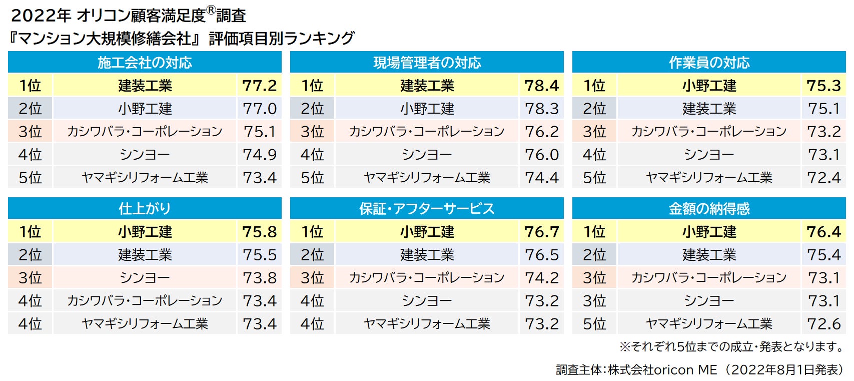 2022年 満足度の高い『マンション大規模修繕会社』ランキング|【小野工建】が初の総合1位 「保証・アフターサービス」でとくに高評価に