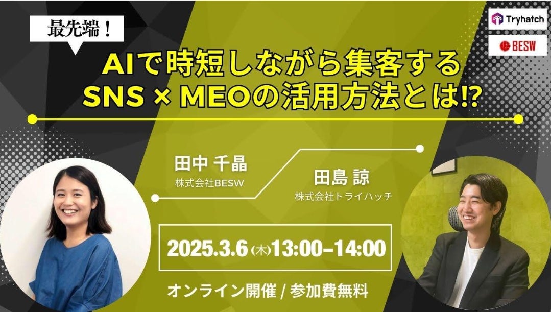 株式会社ベクトル(本社:東京都港区、代表取締役会長兼社長:西江 肇司、東証プライム:6058)の子会社である株式会社トライハッチ(東京都新宿区、代表取締役社長、武藤 尭行)は、株式会社BESW(本社:東京都台東区、代表取締役:田中 千晶)と共同で、無料オンラインセミナー「最先端!AIで時短しながら集客するSNS✖MEOの活用方法とは⁉︎」を2025年3月6日(木)13:00より開催いたします。