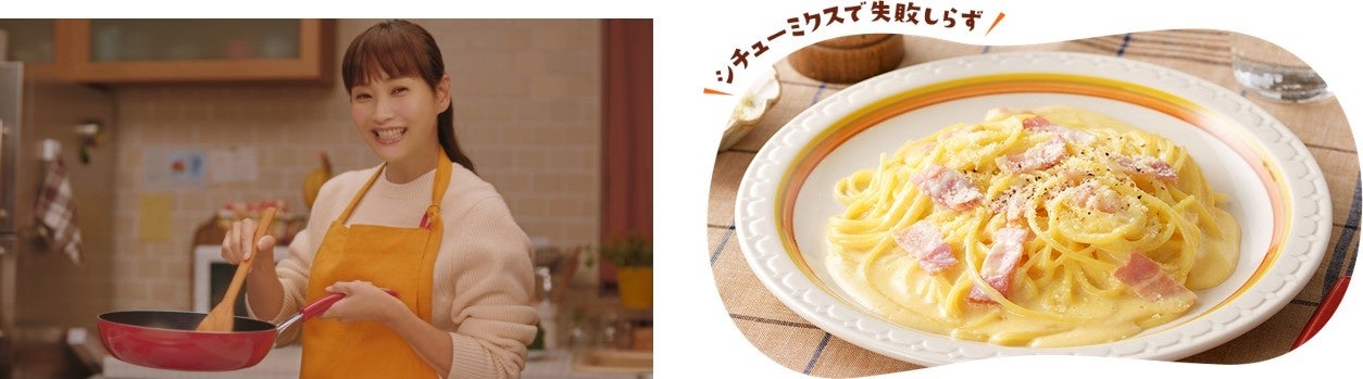 藤本美貴さん出演のTVCMにて、「シチューミクス」<クリーム>を活用したアレンジレシピとして『生クリームいらずの濃厚カルボナーラ』を紹介しています。昨年はエリア限定オンエアでしたが、今秋からは全国オンエアへと拡大し、顆粒タイプだからシチュー以外のメニューにも使いやすいことについてプロモーション面でも訴求を強化してまいります。