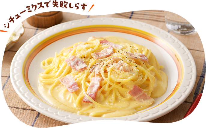 ・生クリームいらずの濃厚カルボナーラ(「シチューミクス」<クリーム>使用)