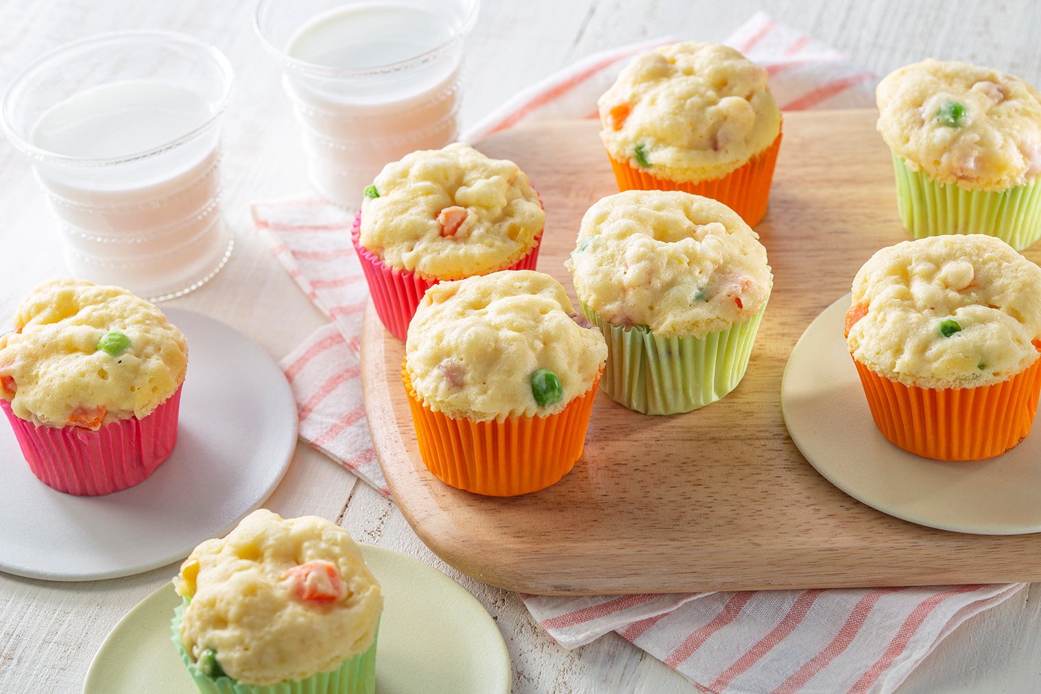 ・スイートコーン風味のカラフル蒸しパン(「シチューミクス」<スイートコーン>使用)