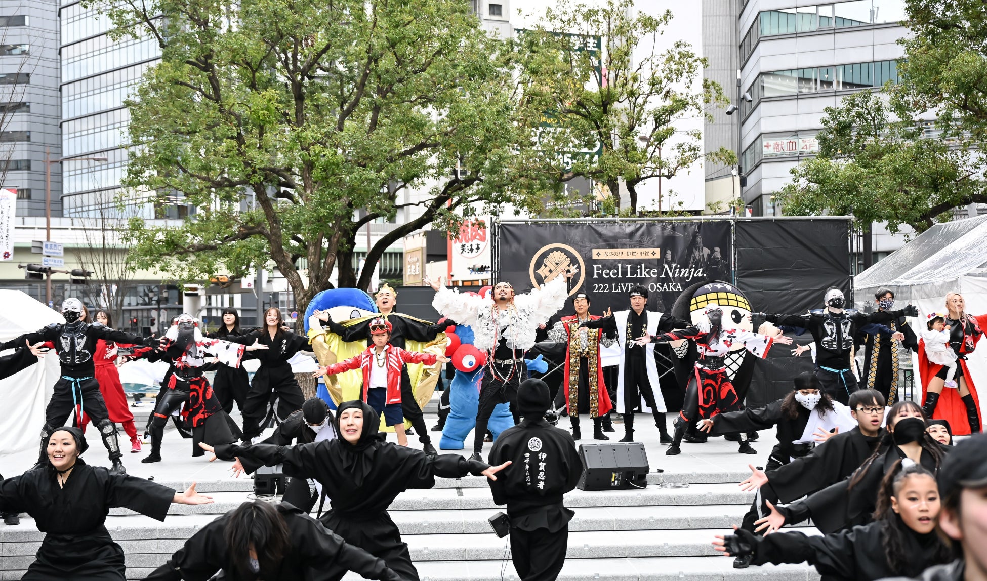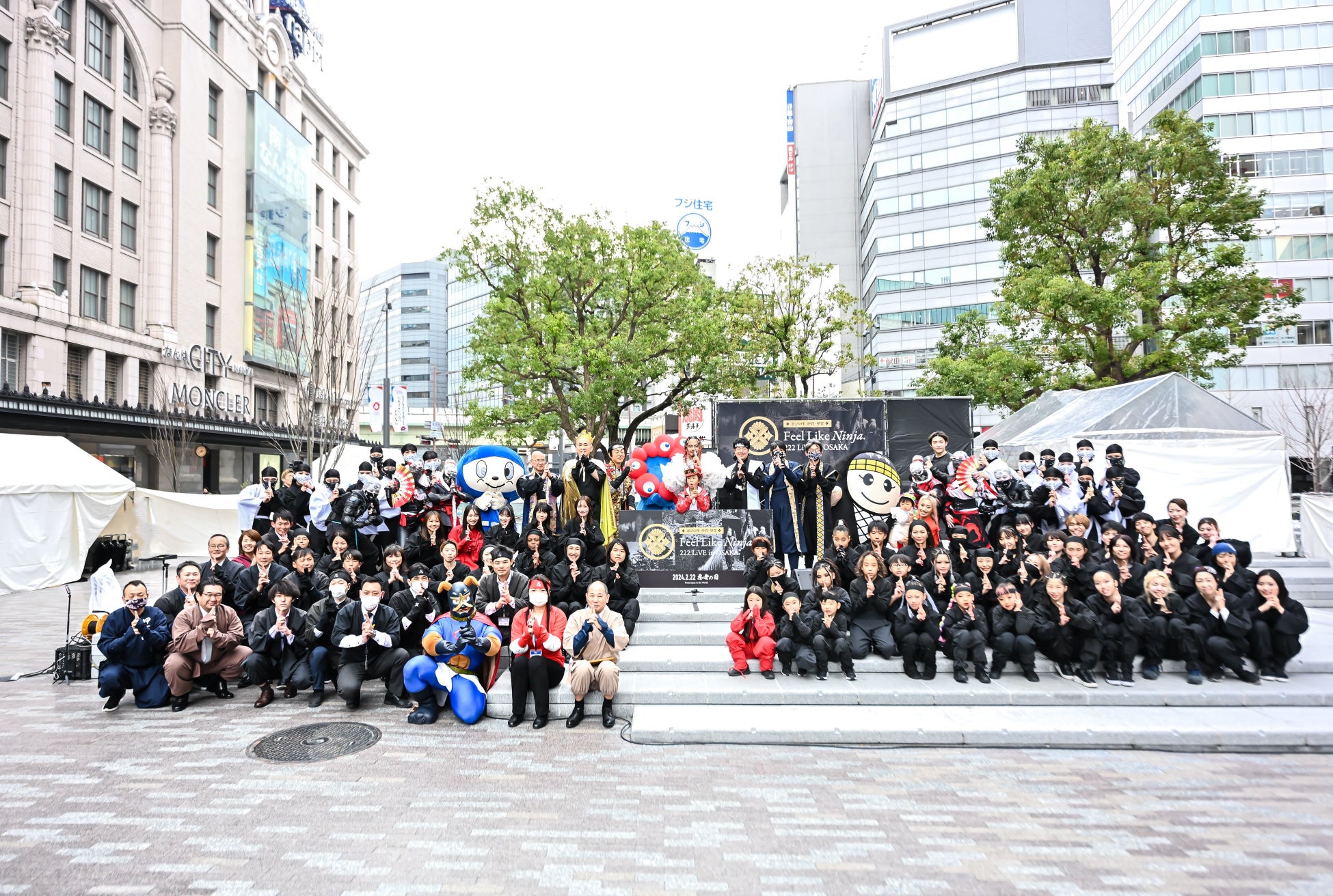昨年、2023年の「忍者の日」に締結された、観光振興の推進に関する6者間での連携協定を受けて、今年は、2025年に控える大阪・関西万博も見据えて、伊賀市と甲賀市の歴史・文化・自然などを活用した大阪を起点とする広域周遊観光ルートの構築、訪日外国人旅行者等の誘客を目的に、世界をひきつける観光拠点として大阪に新たに誕生した「なんば広場」を舞台に、世界へ向けて2024年2月22日(木)午後2時22分に、世界で活躍するKENTO MORI(ケント・モリ)と、NINJAダンサーズ、そして、一般公募した忍者が集結し、スペシャル忍者パフォーマンスを披露しました。