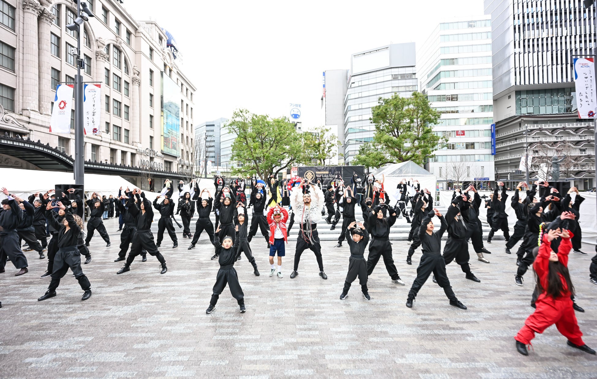 本日の「忍者の日」を盛り上げるため、KENTO MORI(ケント・モリ)と日本各地から集められた精鋭のNINJAダンサーズ、各地の一般公募での参加のみなさん、ミャクミャク、にん太、にんじゃえもんも巻き込んだスペシャルパフォーマンスを披露。