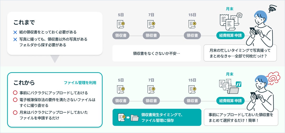 バクラク申請・バクラク経費精算、「ファイル管理機能」をリリース。申請前に領収書や請求書をアップすることで月末の申請作業を効率化