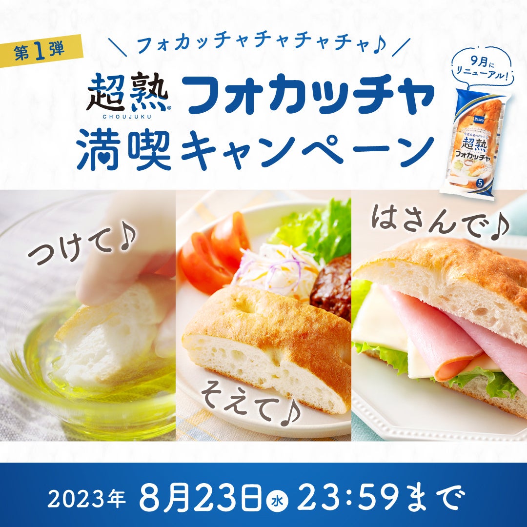 9月にリニューアルする「超熟フォカッチャ」の新しいおいしさを楽しめる、「超熟フォカッチャ満喫キャンペーン」を実施します。第1弾として、簡単なクイズに答えて応募するだけで、抽選で300名様に「フォカッチャ食べ比べセット」をプレゼント。
