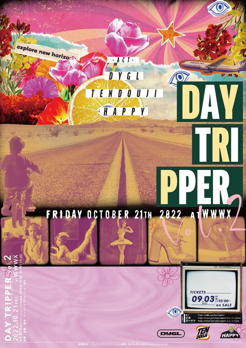 2022年10月21日(金)に東京・WWWXで行うイベント「Day Tripper Vol.2」(デイトリッパー)に、DYGL、TENDOUJI、HAPPYの出演が決定しました。