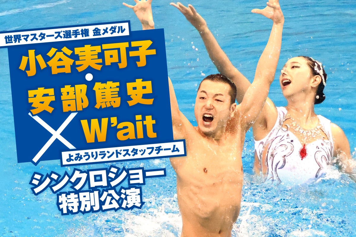 今年3月に行われた世界マスターズ選手権のアーティスティックスイミング(AS)混合デュエットで金メダルを獲得した小谷氏、安部氏のペアによる演技を間近で見られる特別公演です。ソウルオリンピックで初の女性旗手を務め、ソロとデュエットで銅メダルを獲得した小谷氏は、現在も世界的に活躍しながら、国内でのAS普及にも尽力しています。世界水泳で男子AS史上初のメダリストとなり、シルクドゥソレイユ「O」にも出演した安部氏は、帰国後も後進の指導と育成に尽力し、日本男子AS界の先駆者として活躍中です。今回の公演では安部氏も指導にあたっているよみうりランドスタッフチーム「W’ait」と1日限りのコラボレーションも楽しめます。