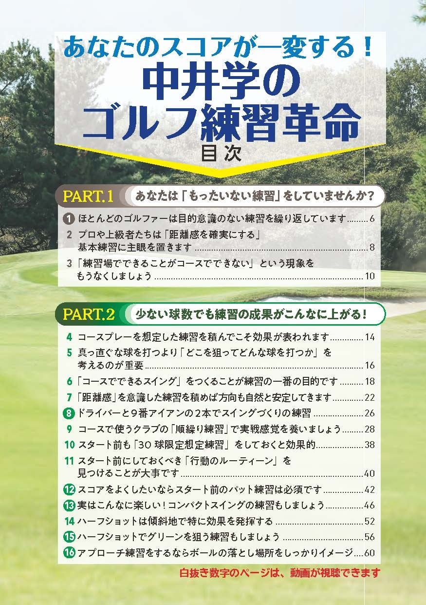 この本では「無駄な練習をしないことが上達の近道」という考えのもと、「練習場」「自宅」「ラウンド前」「ラウンド後」でできる効果的な練習方法をカラー写真で紹介。さらに、QRコードから視聴できる動画からもその方法が確認できる。今の練習にひと手間加えれば「次のラウンドで驚きのスコアアップ」できる、その練習テクニックのすべてが詰まった一冊!