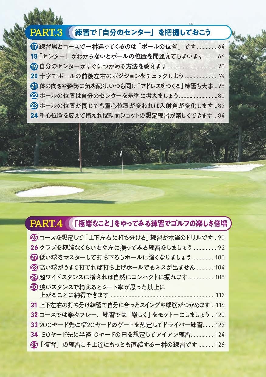 ②圧倒的なレッスン数でゴルファーの悩みに精通している著者ならではの具体的な練習法を解説