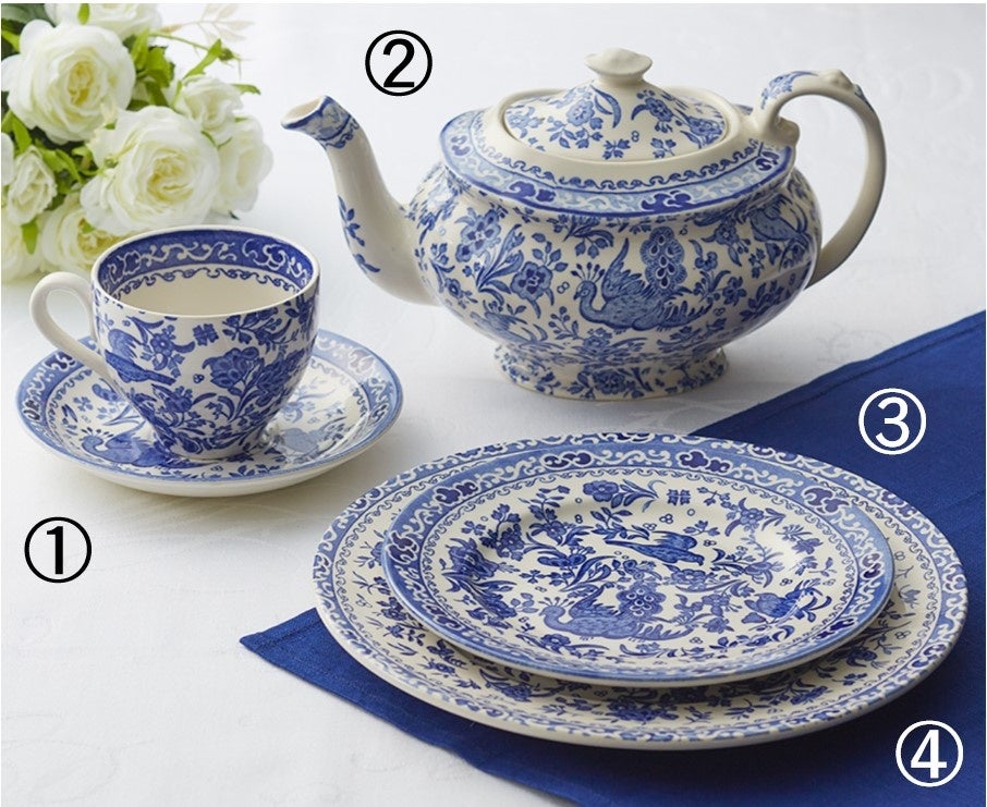1913年国王ジョージと王妃メアリーのためにお披露目された孔雀モチーフのデザイン「リーガルピーコック」を、昔ながらの「銅版転写」で絵付けした格式高いティーセット。