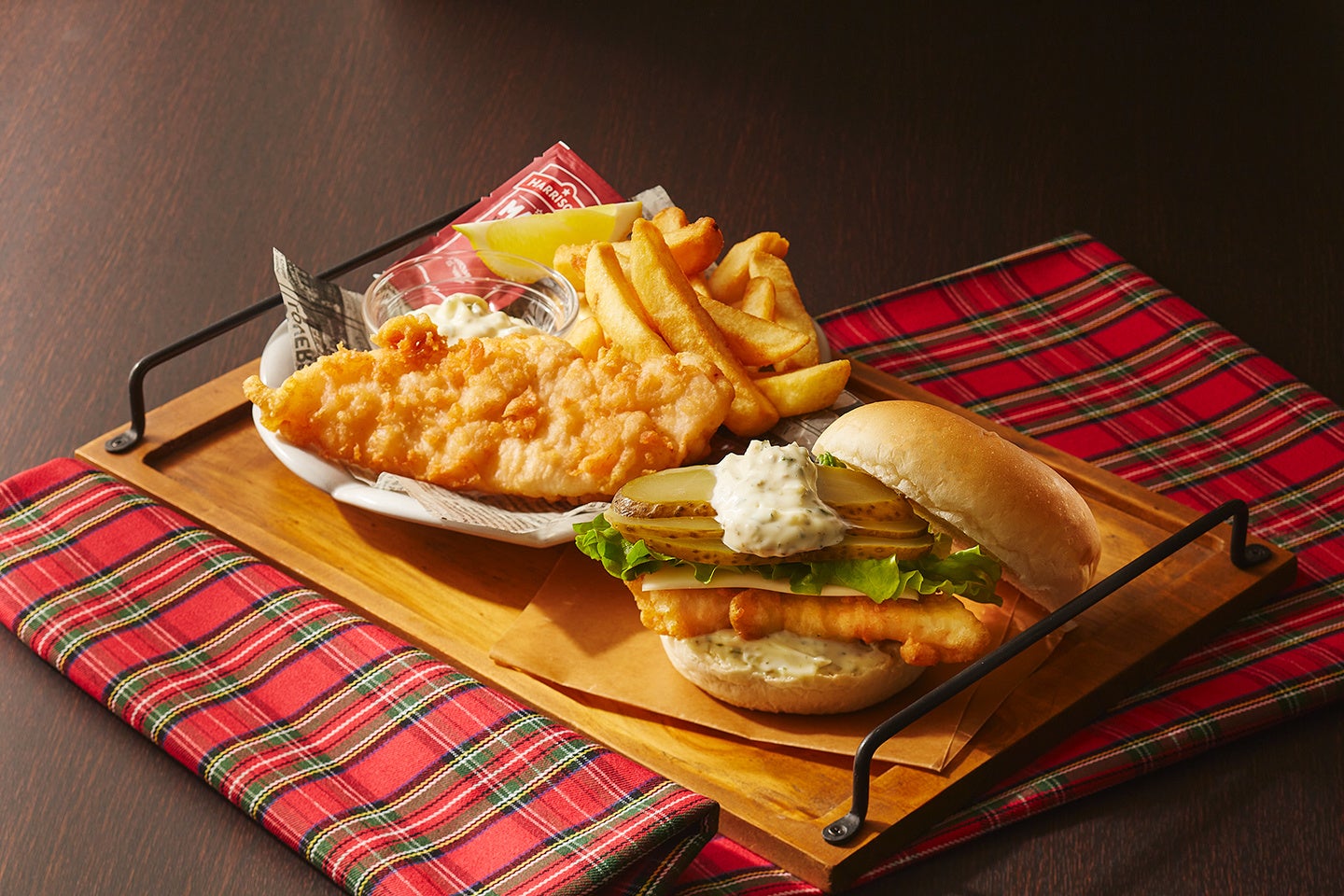 アイルランド産の大西洋タラを英国直輸入のオリジナルの揚げ粉で揚げた、外はカリサク、中はふんわり食感のフィッシュフライが魅力。フライとチーズを挟んだバーガーはボリューム満点。