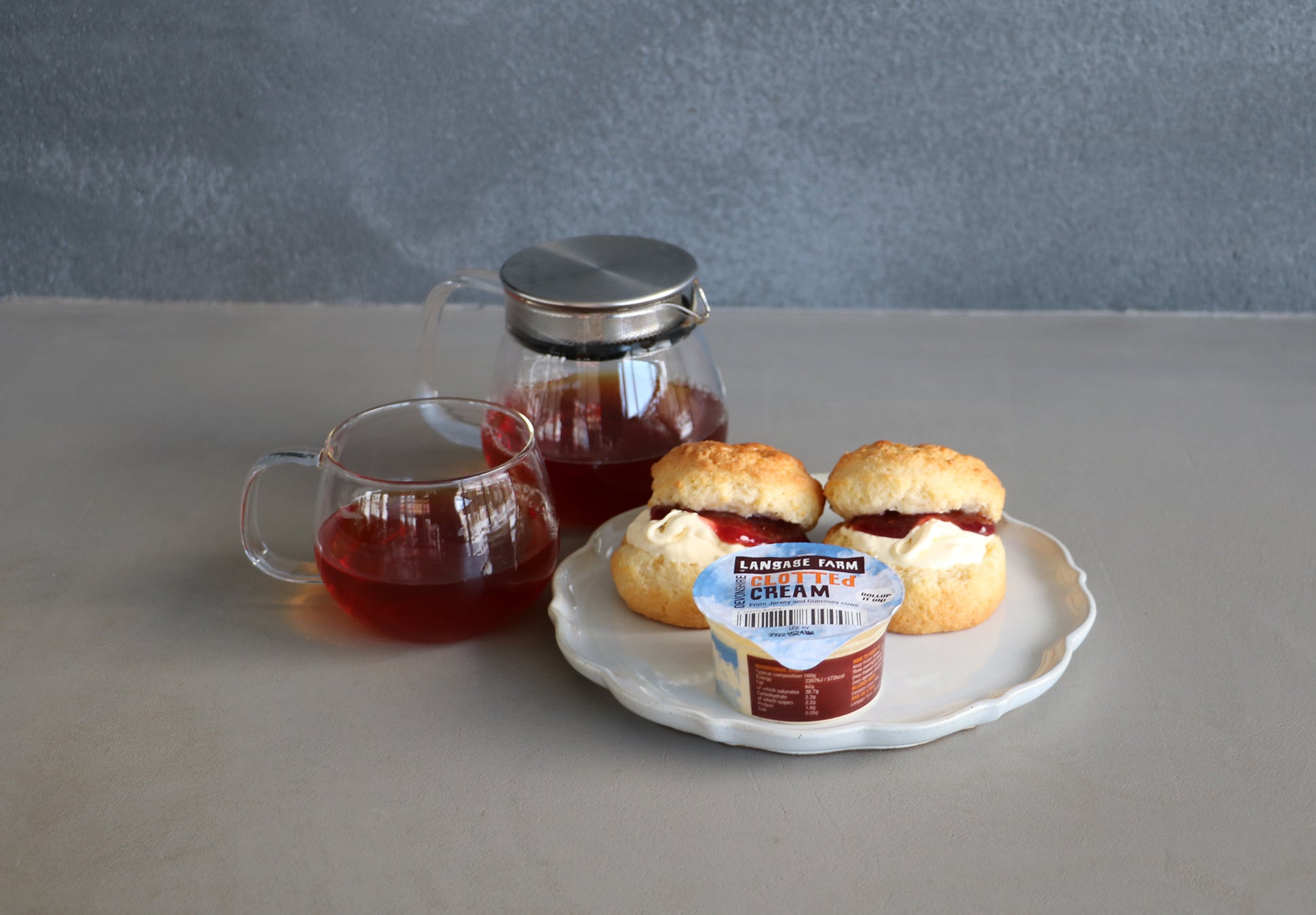 バターと生クリームの中間のようなコクのあるクリームを、温かいスコーンにたっぷりつけて食べるのが現地流。