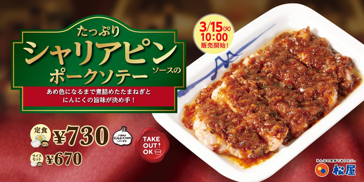 このたび松屋フーズ(本社:東京都武蔵野市、代表取締役社長:瓦葺一利)では、牛めし・カレー・定食・その他丼の「松屋」におきまして、2022年3月15日(火)午前10時より「たっぷりシャリアピンソースのポークソテー」を発売いたします。