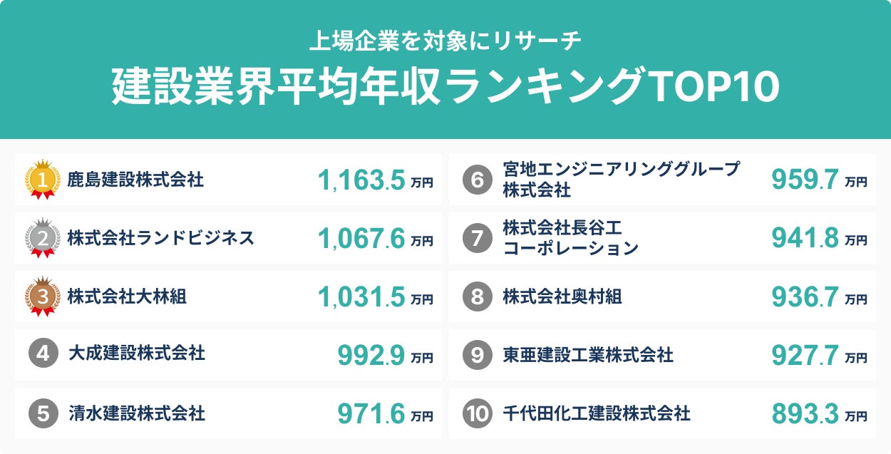 上位3社は年収1,000万円超!?建設業界平均年収ランキングTOP10を発表!/SalesNow DBレポート