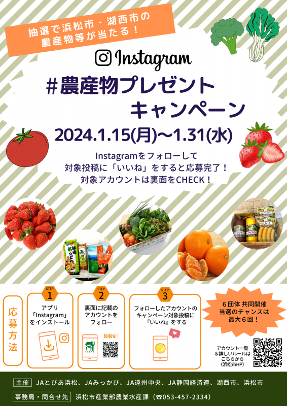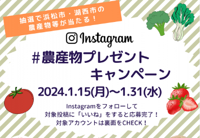 浜松市が運営するインスタグラムアカウント「はまのう」と、「湖西市」、「JA静岡経済連」、「JAとぴあ浜松」、「JAみっかび」、「JA遠州中央」は共同で、浜松・浜名湖地域の農産物等が当たるプレゼントキャンペーンを実施します。