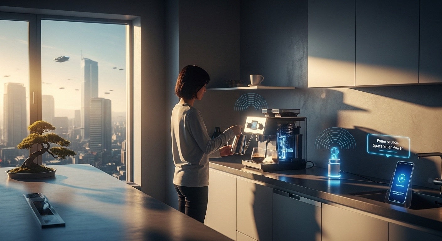 宇宙でつくられた電気が、このキッチンに届いている。地球の上空では、発電衛星が昼夜を問わず電気をつくり続けている。