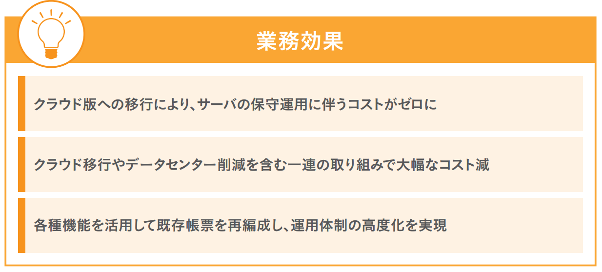 また、15年近く運用していたオンプレミス版から移行したことで、サーバの維持管理にかかるコストがゼロになり、データセンターの削減とあわせて大幅な経費節減を実現しました。