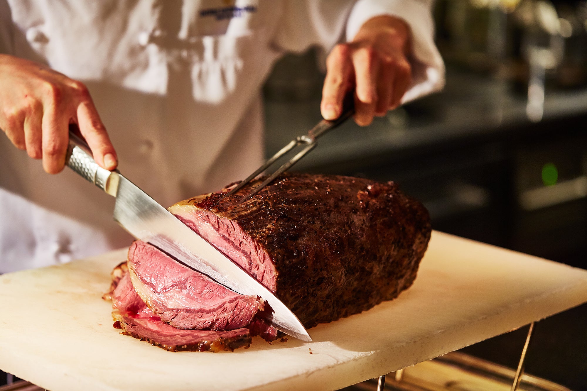 (左)シェフが目の前でローストビーフをカッティング、(右)スライスしたローストビーフを贅沢に挟んだバーガーはランチ限定で提供