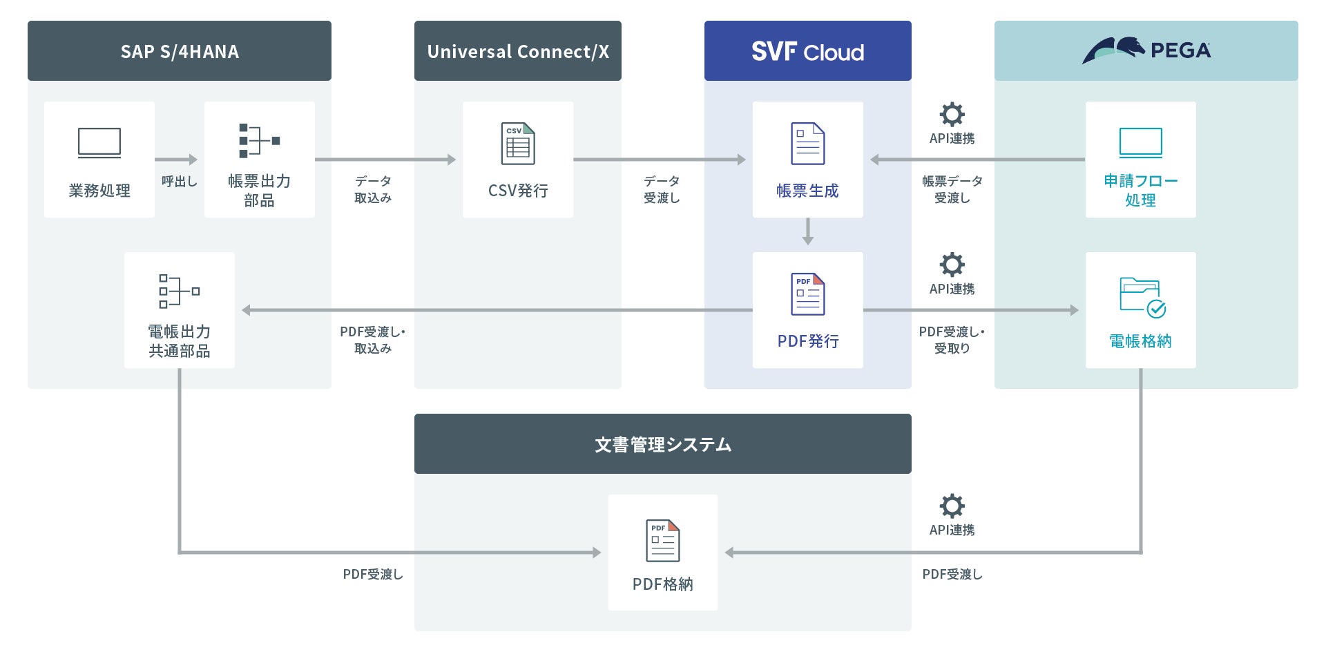 新たな基幹システムは2023年5月から運用を開始しました。現在では、会計コアであるSAP S/4HANAから出力される会計関連の帳票に加え、フロントエンドを担う Pega Platformから発行される請求書、見積書、発注書など各種報告書がすべてSVF Cloudを経由して出力されています。