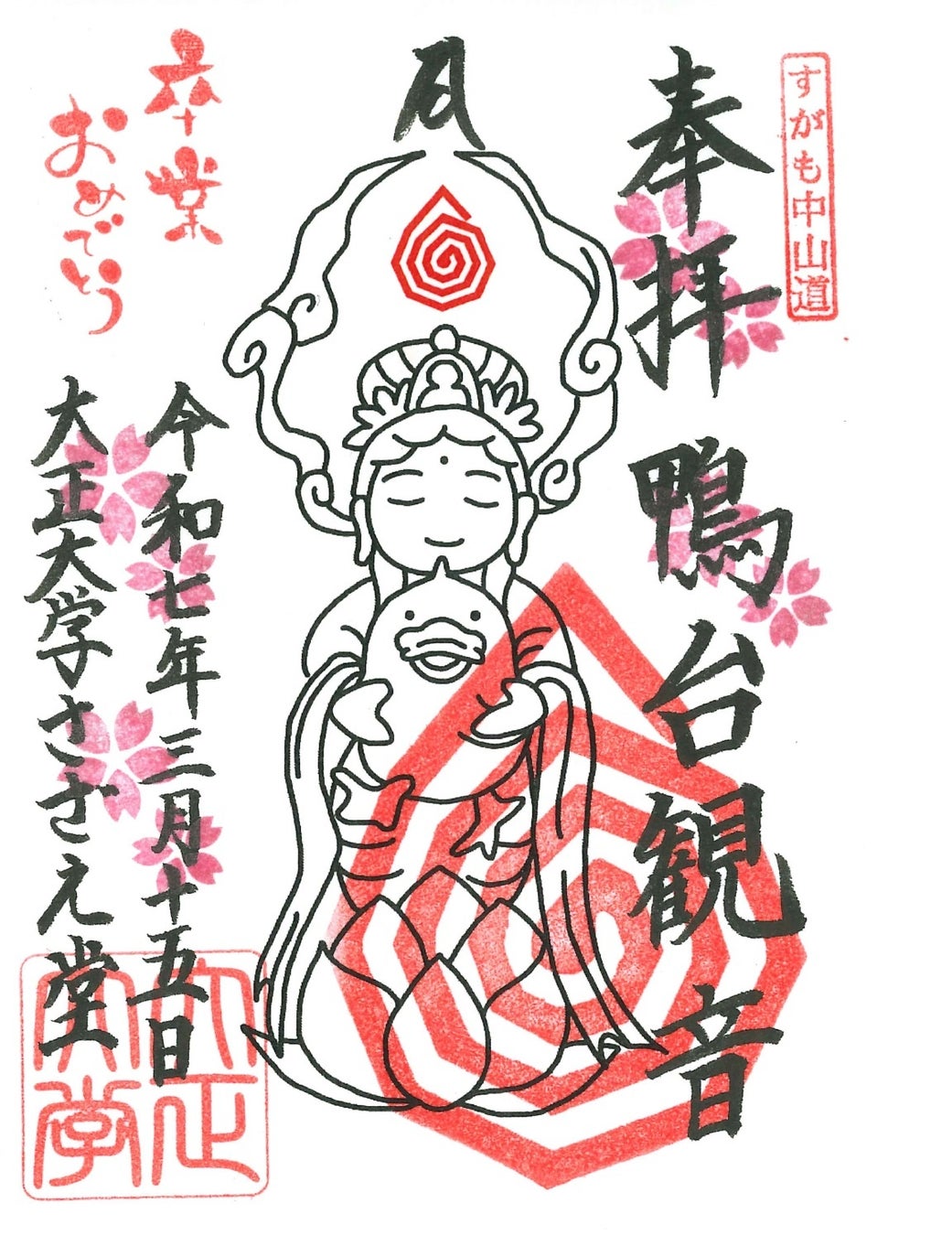 大正大学の仏教施設である鴨台さざえ堂の知名度向上、参拝者増加に向けた取り組みとして「オリジナル御朱印帳」や「鴨台さざえ堂の参拝パンフレット」に加え、御朱印浄書および限定御朱印の企画にも取り組んでいます。