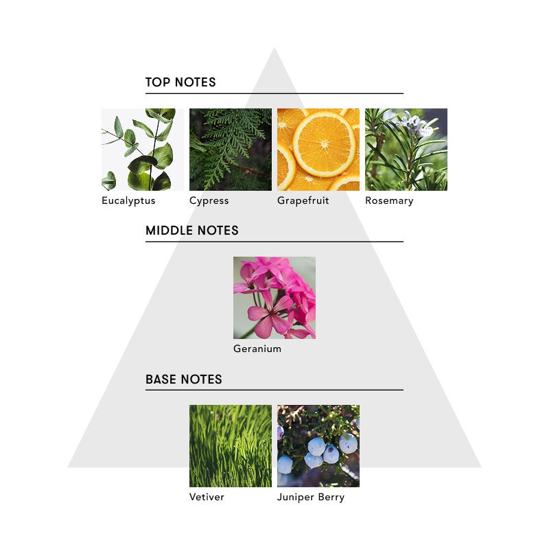 ユーカリ、サイプレス、グレープフルーツ、ローズマリー、ゼラニウム、ベチバー、ジュニパーベリーといった精油を緻密にブレンドしたハーバルウッディ調の香りは、忙しい日々を過ごす私たちに真のリラックス感を提供する、都市生活の中で自然への回帰を求める方に最適な香りです。