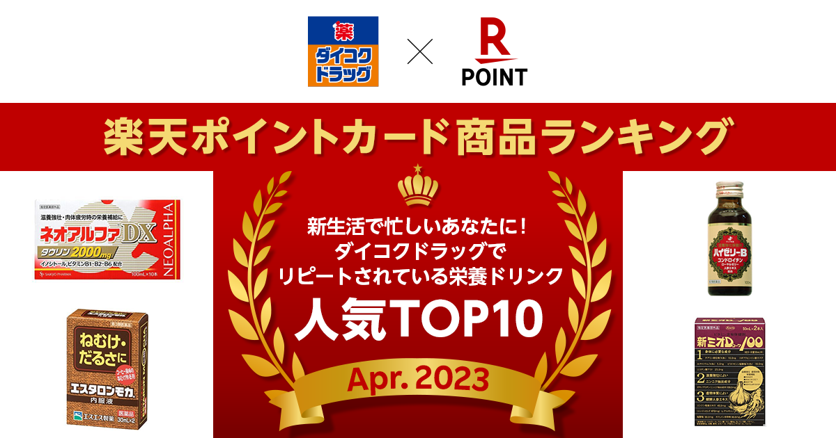 株式会社ダイコク(以下「ダイコク」)と楽天ペイメント株式会社(以下「楽天ペイメント」)は共同で、「楽天ポイントカード商品ランキング」において「新生活で忙しいあなたに!ダイコクドラッグでリピートされている栄養ドリンク人気TOP10」を発表しました。