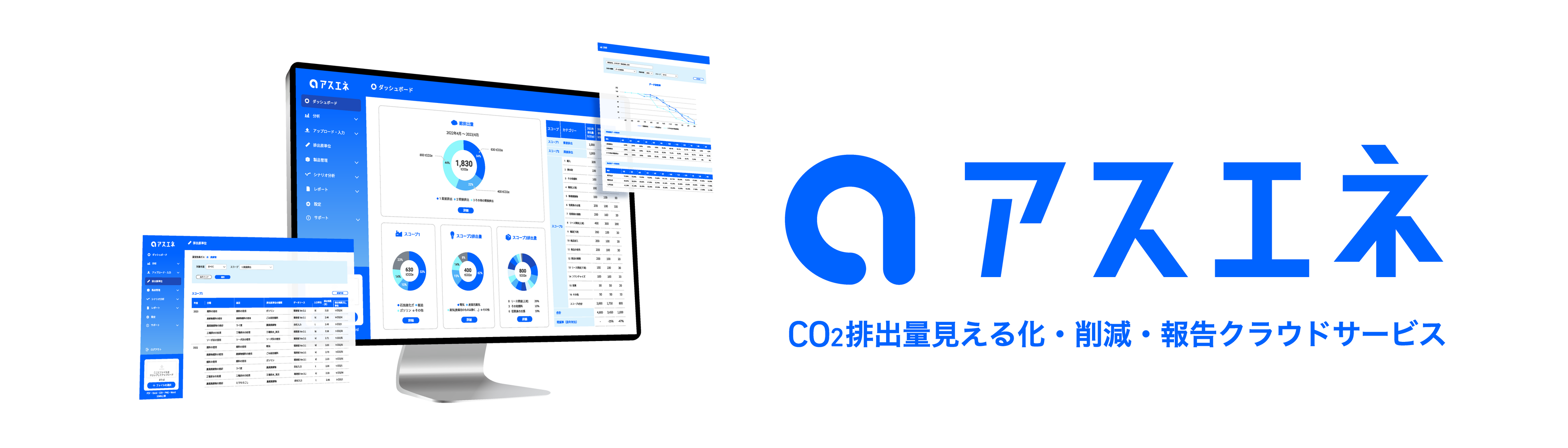 「アスエネ」は、複雑だったCO2排出量算出業務をカンタンにサポートする、CO2排出量見える化・削減・報告クラウドサービスです。温室効果ガス・CO2排出量の算出・可視化、削減・カーボンオフセット、Scope1-3*のサプライチェーン排出量の報告・情報開示を支援します。