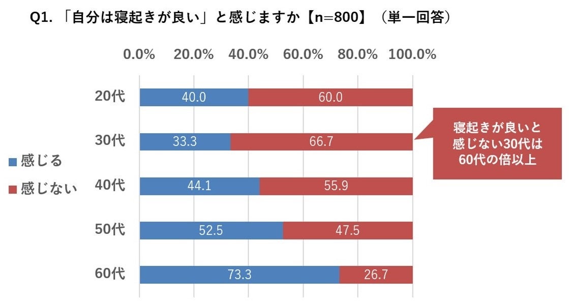 「寝起きが良いと感じない人」は60代が26.7%に対し、30代は66.7%と倍以上。