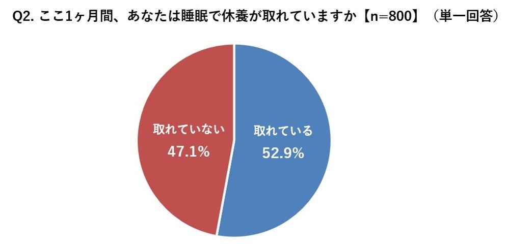 ここ1ヶ月間に睡眠で休養が取れているかを聞いたところ、「取れていない」と回答した人が47.1%となり、約2人に1人は睡眠で十分な休養が取れていないことがわかりました。