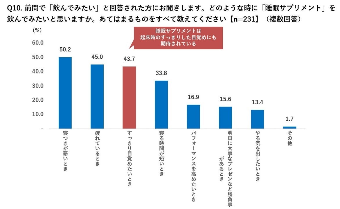 ・ビジネスパーソンの3人に1人が睡眠サプリメントを飲んでみたいと回答。飲みたいシーンの上位は「寝つきが悪いとき(50.2%)」「疲れているとき(45.0%)」「すっきり目覚めたいとき(43.7%)」。入眠時だけではなく翌朝のすっきりした目覚めにも需要あり。