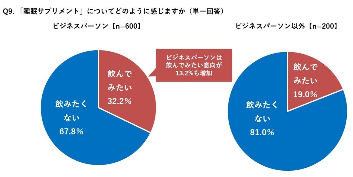 最後に、睡眠サプリメントを飲んでみたいかどうかを聞いたところ、ビジネスパーソンの3人に1人(32.2%)が睡眠サプリメントを飲んでみたいと回答しました。またビジネスパーソン以外の人は飲んでみたいと思っているのは19.0%となり、その差が13.2%もあることがわかりました。