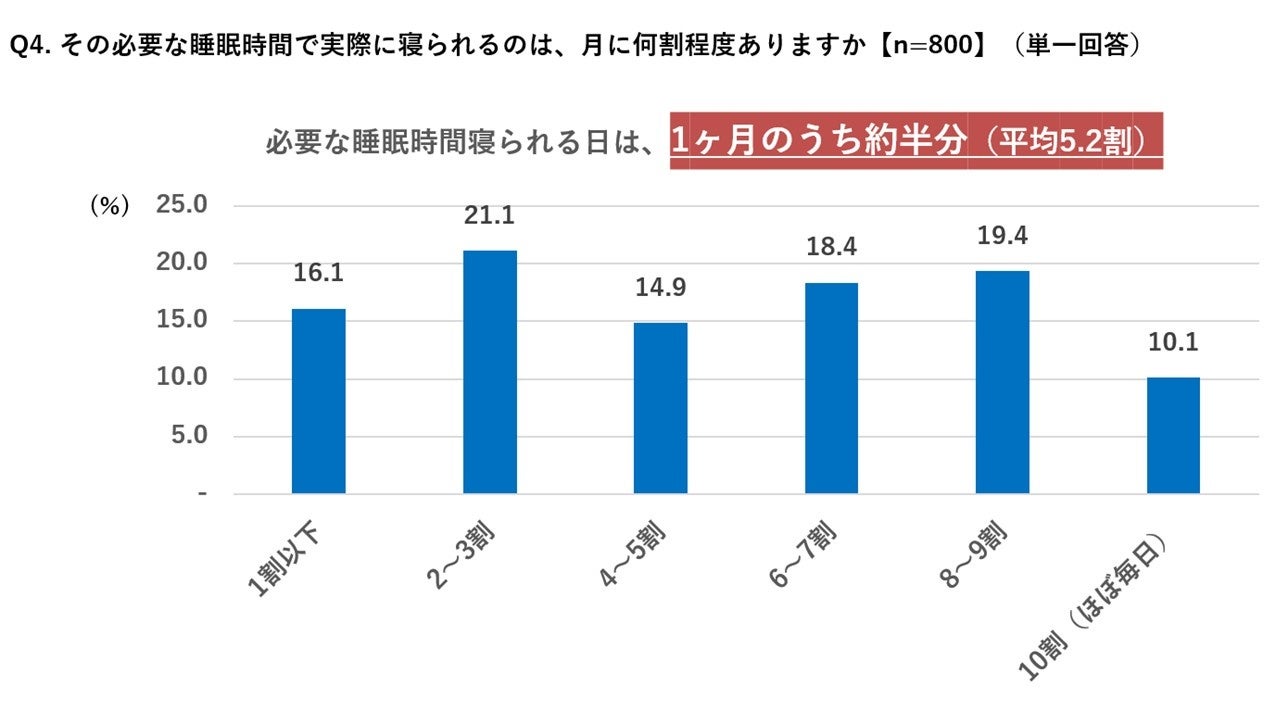 一方でその睡眠時間を確保できているのは、ひと月のうちわずか半分と低頻度。