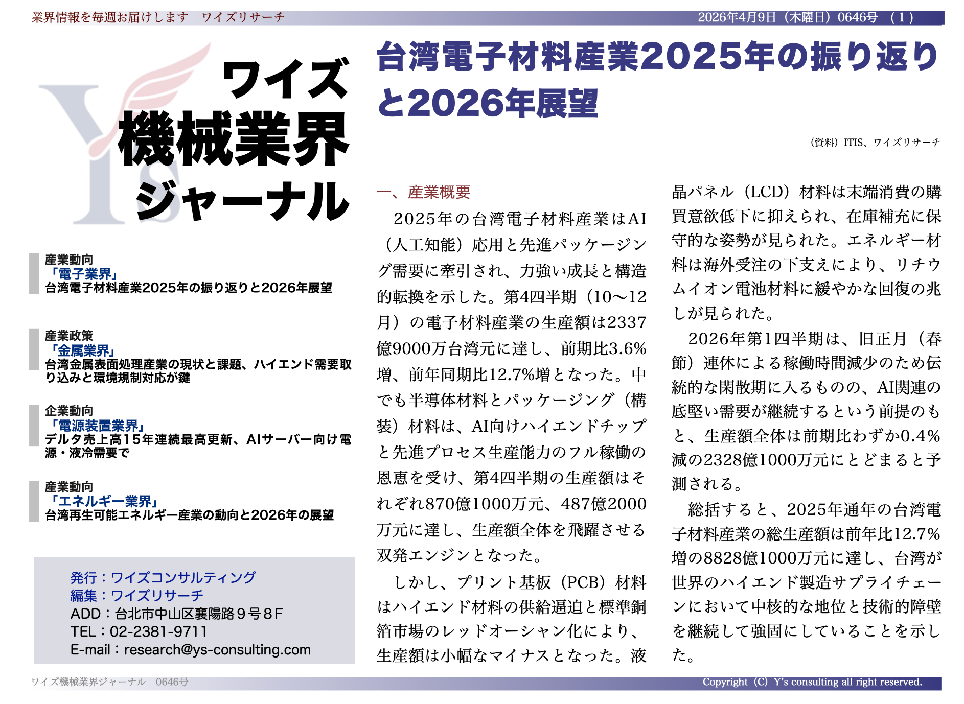 ワイズコンサルティング グループ(本社:中華民国台北市、代表取締役:吉本康志)は台湾機械業界専門誌「ワイズ機械業界ジャーナル」の2026年4月第2週号を発行しました。