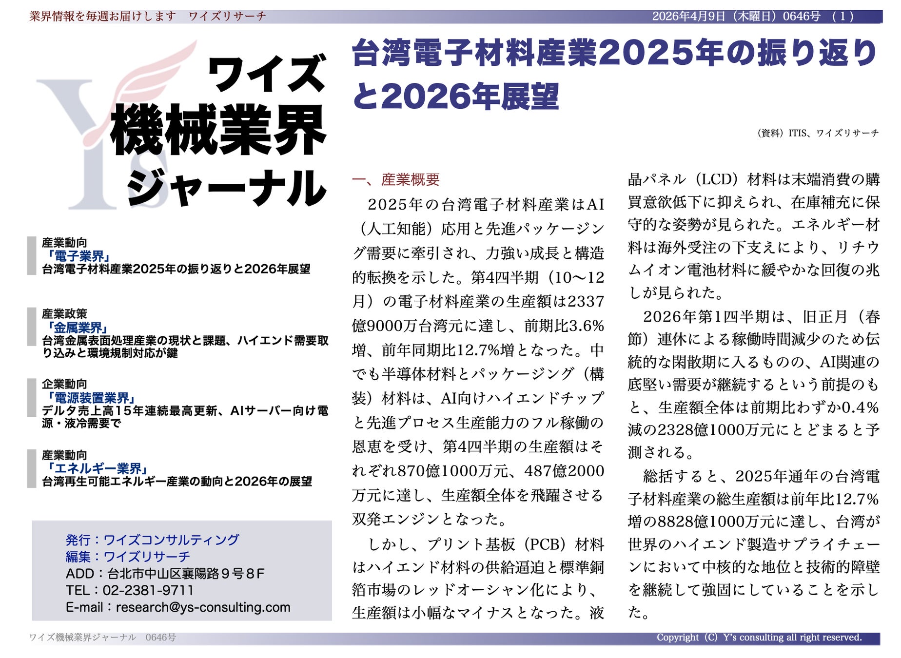 【台湾情報】台湾電子材料産業、AI需要で飛躍──2025年生産額は12.7%増<ワイズ機械業界ジャーナル2026年4月第2週号発行>