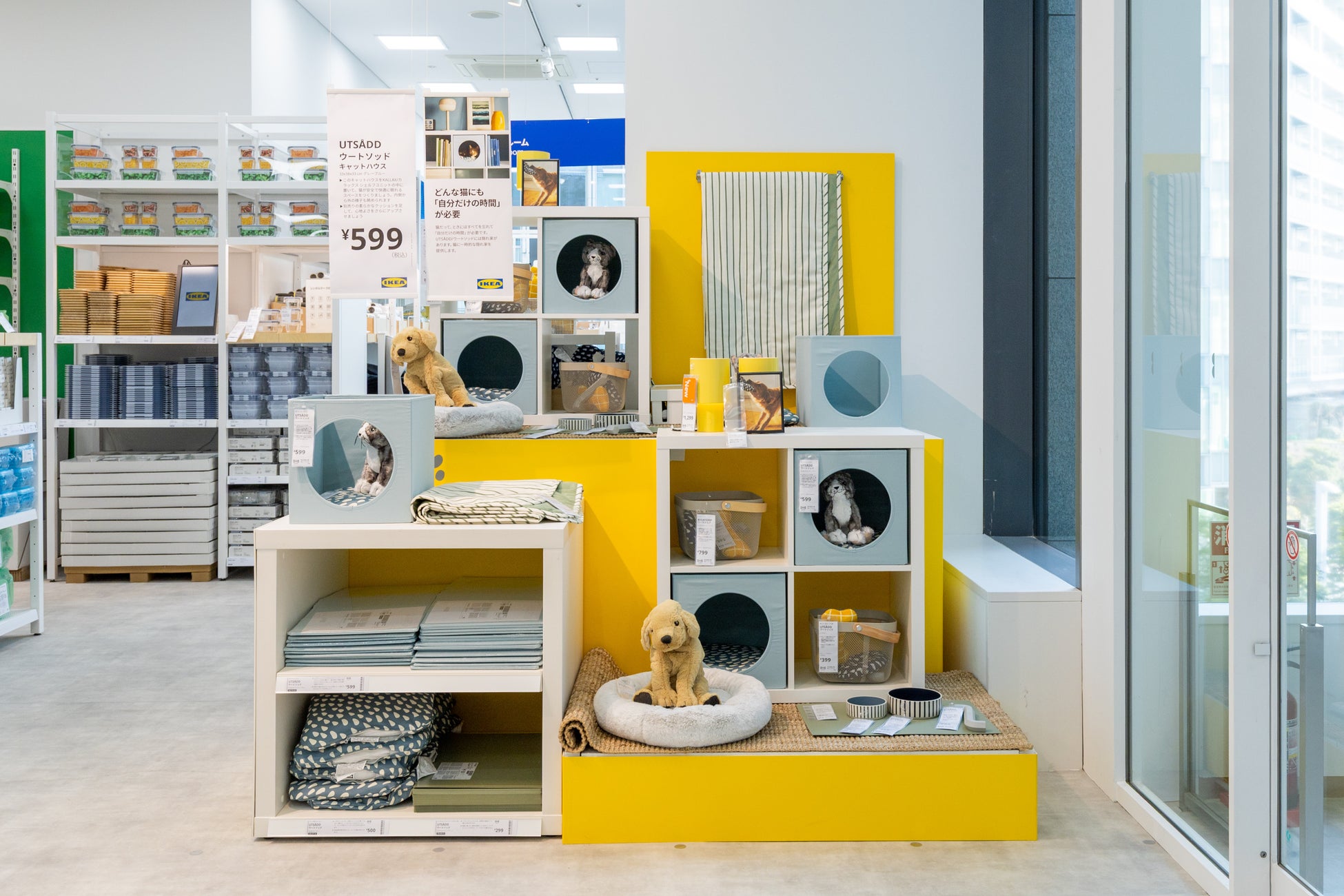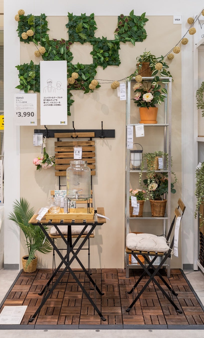 IKEA 横浜ベイクォーターの特徴として、横浜およびその周辺にお住いの方々の暮らしやニーズに沿って商品やソリューションを提案しています。例えば、周辺のお住いの方は小さなバルコニーをもっている方も多いことから、フロアデッキや折りたたみ式のアウトドア家具を活用した、お手ごろ価格で実現できるバルコニー空間、またペットとの暮らしを楽しんでいる方も多いことから、ペットとの家での暮らしをより快適で明るくするアイデアを提案しています。また近隣にオフィスなど多数ありビジネス需要を見込みデスクの展示を行っています。