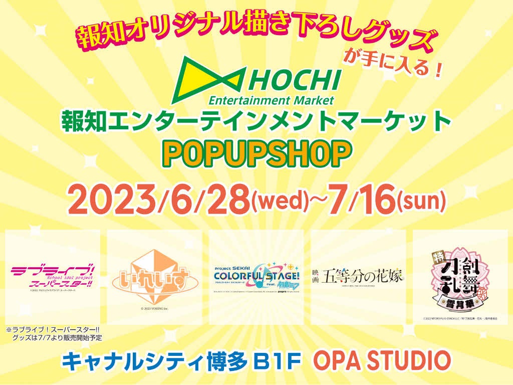 6月28日、キャナルシティ博多B1F OPA STUDIO内に、期間限定の「報知エンターテインメントマーケット POP UP SHOP」をオープン。スポーツ報知が取り扱ってきた「ラブライブ!スーパースター!!」「いれいす」「プロジェクトセカイ カラフルステージ! feat. 初音ミク」(プロセカ)、映画「五等分の花嫁」、「特刀剣乱舞~雪月華~」などの特別号、グッズを販売します。