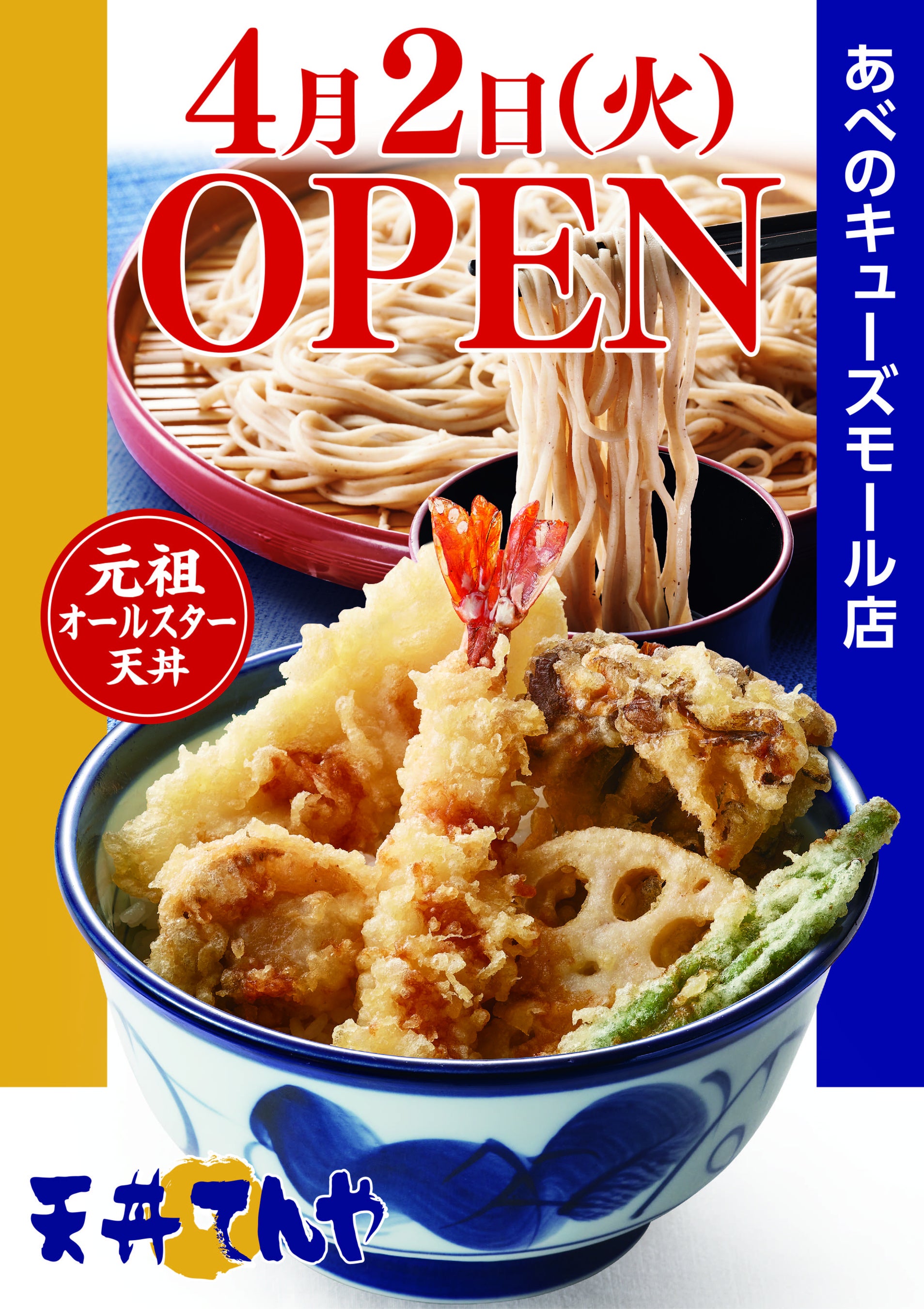 天王寺駅直結徒歩2分!大阪で4店舗目の直営店「天丼てんや あべのキューズモール店」 4月2日(火)オープン!