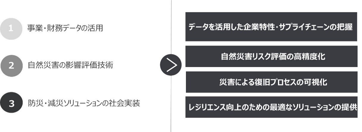これまでも、損保ジャパンとSOMPOリスクは、研究機関等との共同研究を通じて、自然災害リスクを定量的に評価する技術や、自然災害による産業ごとの経済損失をマクロベースで評価する技術などを構築してきましたが、持続可能な事業継続体制の構築には企業の属性やサプライチェーンを考慮した評価技術の向上が必要と考えています。そこで、災害大国日本におけるレジリエントな社会創りのため、最新技術を開発し、社会実装に向けたフロンティア開拓を進めていくことを目的に、損保ジャパンとSOMPOリスクは自然災害の経済影響評価について知見のある京都大学防災研究所と共同で、産学官がデータ・人材を出し合って、災害時における財務影響の定量評価手法の開発と評価技術を活用した事業継続のためのファイナンス手法の研究開発を行う日本初の研究部門を設立しました。