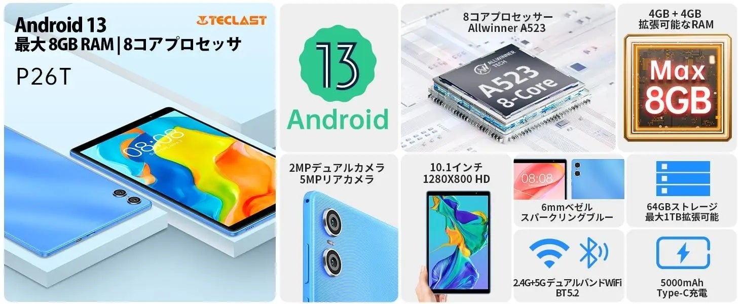 10インチ / Android 13 / 8GB(4+4GB拡張)RAM+64GB ROM+1TB拡張 / WideVine L1対応 / WiFiモデル / デュアルカメラ / 画面分割 / 3.5mmヘッドフォンジャック / 児童守護