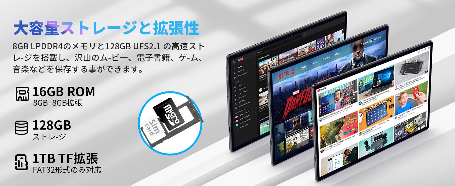 10インチ / Android 12 / 16GB(8GB+8GB拡張) RAM+128GB ROM+1TB拡張 / FHD IPSディスプレイ / Widevine L1 / 4G LTE SIM通話+WIFIモデル / 顔認識 / 3.5mmヘッドホン /GPSサポート